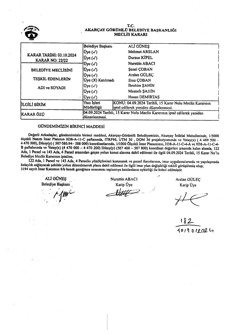 H38-A-11-C-4-B paftalarında ve Yatay(x) (4 470 000 – 4 470 200) Dikey(y) (587 400 – 587 800) koordinat değerleri arasında kalan alanda, 122 Ada, 1 Parsel ve 143 Ada, 4 Parsel arasından geçen yolun konut alanına dahil edilmesi ile ilgili 04.09.2024 Tarihli, 15/15 Karar No’lu Belediye Meclis Kararının iptaline,